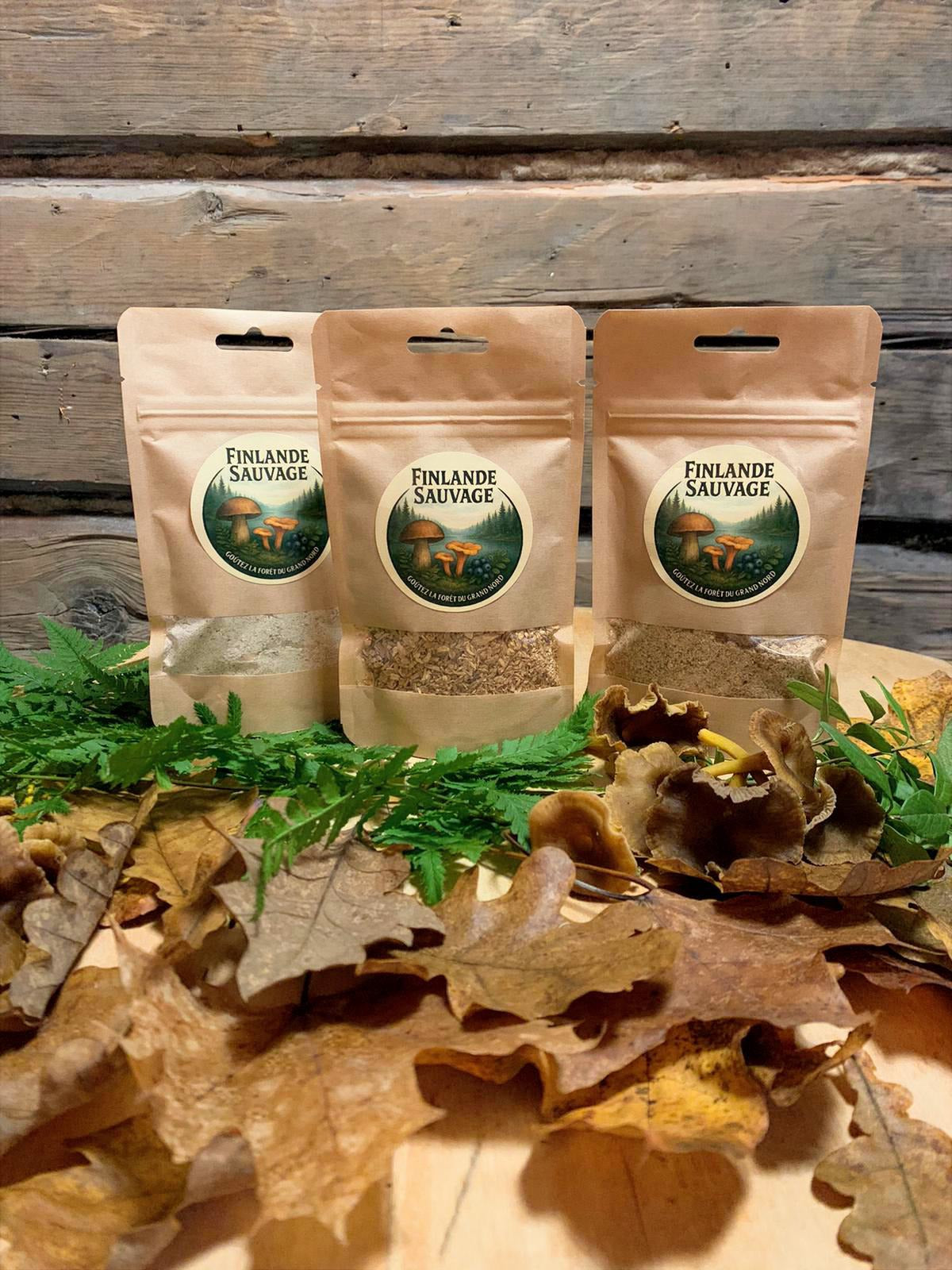 Ce coffret réunit trois poudres de champignons séchés – cèpe, girolle et chanterelle tube – préparées artisanalement à partir de récoltes finlandaises.